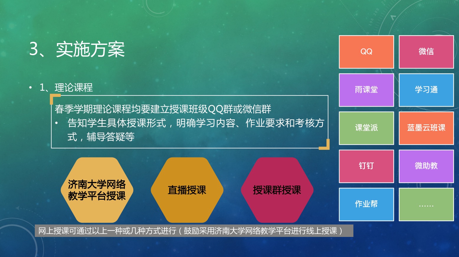 学院组织系部主任召开网上授课专题会议,强调网上授课重要性以及相关注意事项;成立学院在校授课服务保障组,第一时间处理网课过程中出现的问题;组织相关老师录制示范课视频,进行网上示范教学;不定期为老师提供优质课程资源等措施,多方位、多举措推动各专业教师利用各类网络资源开展有效的教学和科研工作;任课教师积极组建课程团队,充分利用信息化手段,开展线上教学,为顺利完成疫情防控期间教学任务提供保障。