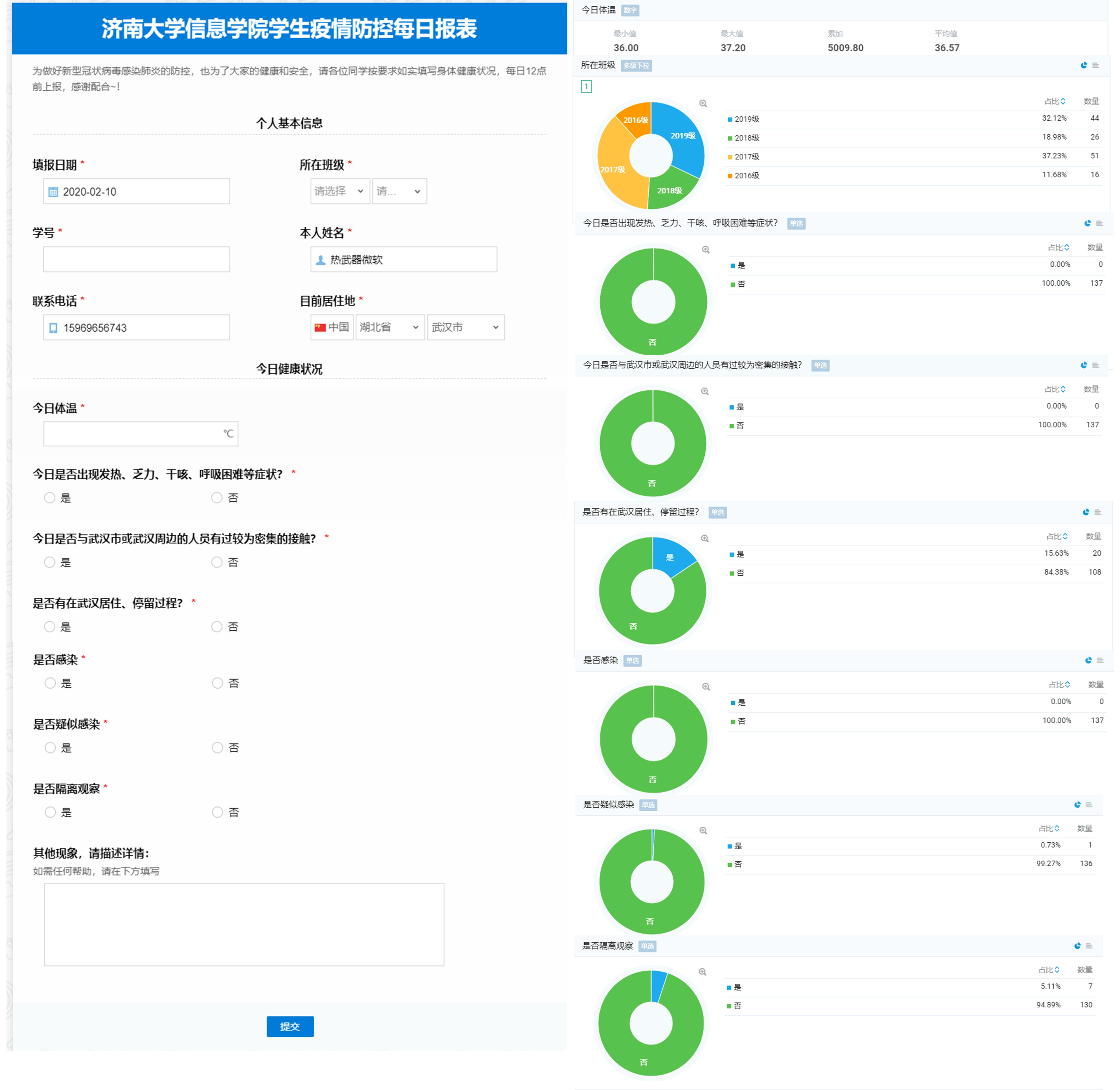 对于学院教职工,建立系部主任定期汇报制度,对本系部教师情况进行摸排汇总,并及时汇报;对全体学生,以年级、班级为单位,建立辅导员—主要学生干部—全班学生的疫情防控信息网,每日排查班级同学身体健康情况并汇总上报,实时掌握全院学生情况,并及时通过网络宣传、群发通知等方式号召同学们响应国家和学校号召,服从当地、学校、学院疫情防控工作安排,居家做好科学抗疫的带头者;对有湖北地区停留史、与相关人员有接触以及疫情较严重地区的学生及时进行完善摸排,推出“太阳集团tyc234cc信息学院学生疫情防控每日报表”系统,通过系统可快速、全面的掌握学生每日动态信息,更有针对性的做好疫情防控工作。
