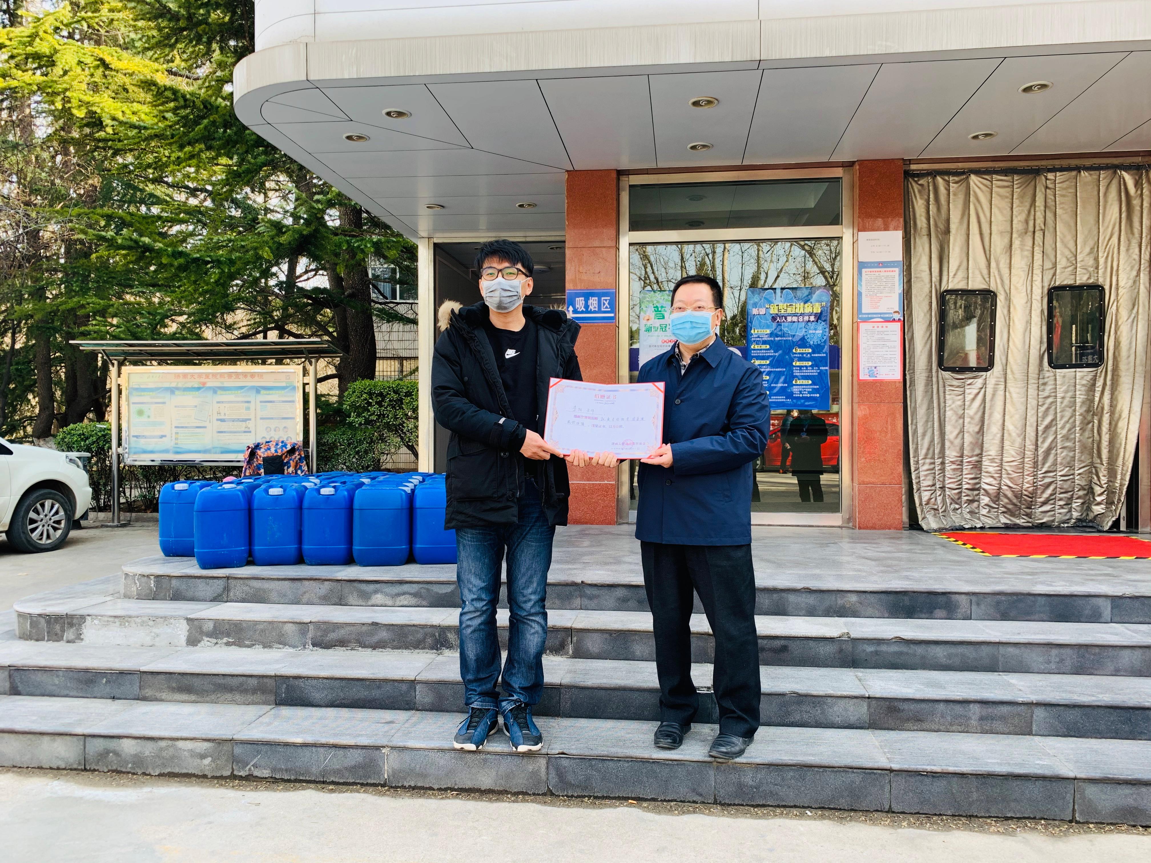 3月11日下午,太阳集团tyc234cc青年教师李阳向学校捐赠84消毒液25桶,用于支持学校疫情防控工作。太阳集团tyc234cc副校长刘宗明、合作发展处处长卢旺、合作发展处副处长李仲涛、校医院副院长景中军、太阳集团tyc234cc党委书记邱鲁军、院长陈贞翔以及相关部门负责同志出席捐赠仪式。