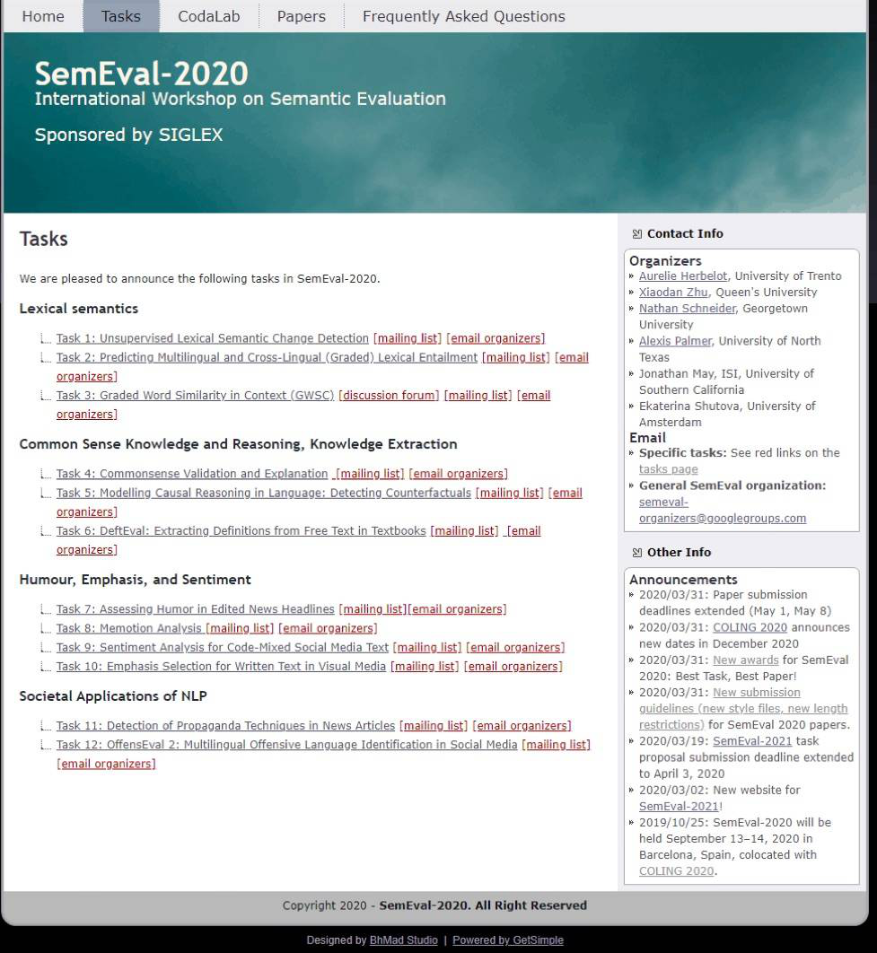 近日,由国际计算语言学会(ACL)下属的专门兴趣小组SIGLEX主办的第十四届国际语义评测比赛(International Workshop on Semantic Evaluation; SemEval 2020)于线上进行。太阳集团tyc234cc马坤老师指导,学生姚胤楠、苏南组成的人工智能自然语言处理研究小组UJNLP在任务的评测中取得了较高名次,在85个队伍中位列第16名。