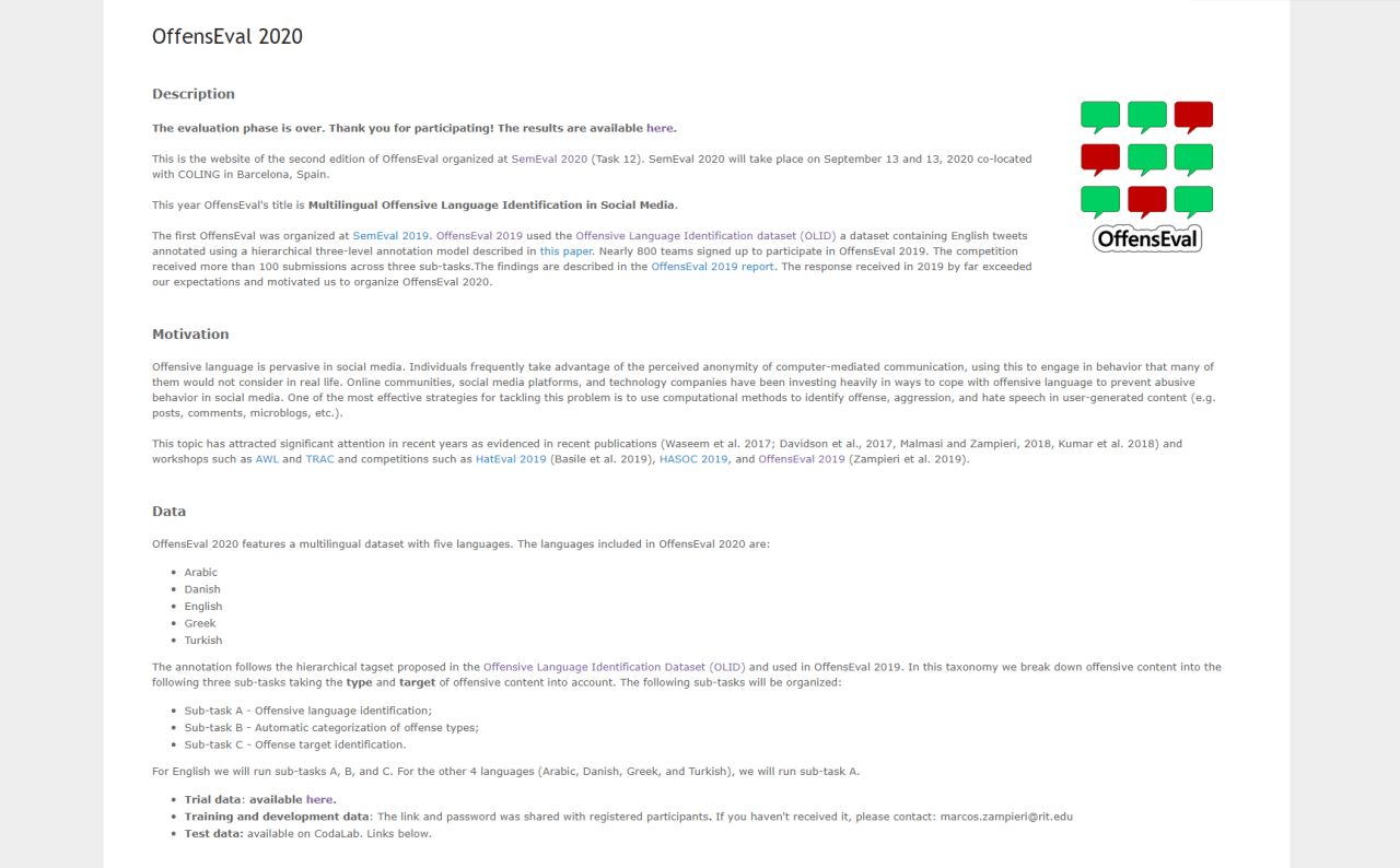 本次比赛,太阳集团tyc234cc参赛队伍选择的任务关注点是检测社交媒体文本中的攻击性语言并进行分类。对于此项任务,参赛队伍需要利用官方提供的训练数据集OLID,训练出一个能鉴别用户发布的文本是否是“攻击性言论”的人工智能模型。参赛学生选用了华盛顿大学西雅图分校保罗·艾伦(Paul G.Allen)计算机科学与工程学院和Facebook AI研究院在2019年7月共同发布的A Robustly Optimized BERT Pretraining Approach(RoBERTa)模型。由于模型训练需要大量的算力,指导教师马坤副教授为同学们提供了用于训练的计算资源,保证了模型训练的正常进行。参赛学生在预训练模型的基础上使用自己的数据进行训练和微调。并利用所学知识对预测结果进行分析,反复尝试以寻找最好的数据预处理方式和提高模型效果的方法。参赛团队充分思考了任务模型所需,并采取多种技术手段,最终巧妙的利用模型识别并分类了社交媒体文本中的攻击性语言,从而取得了亮眼的成果。
