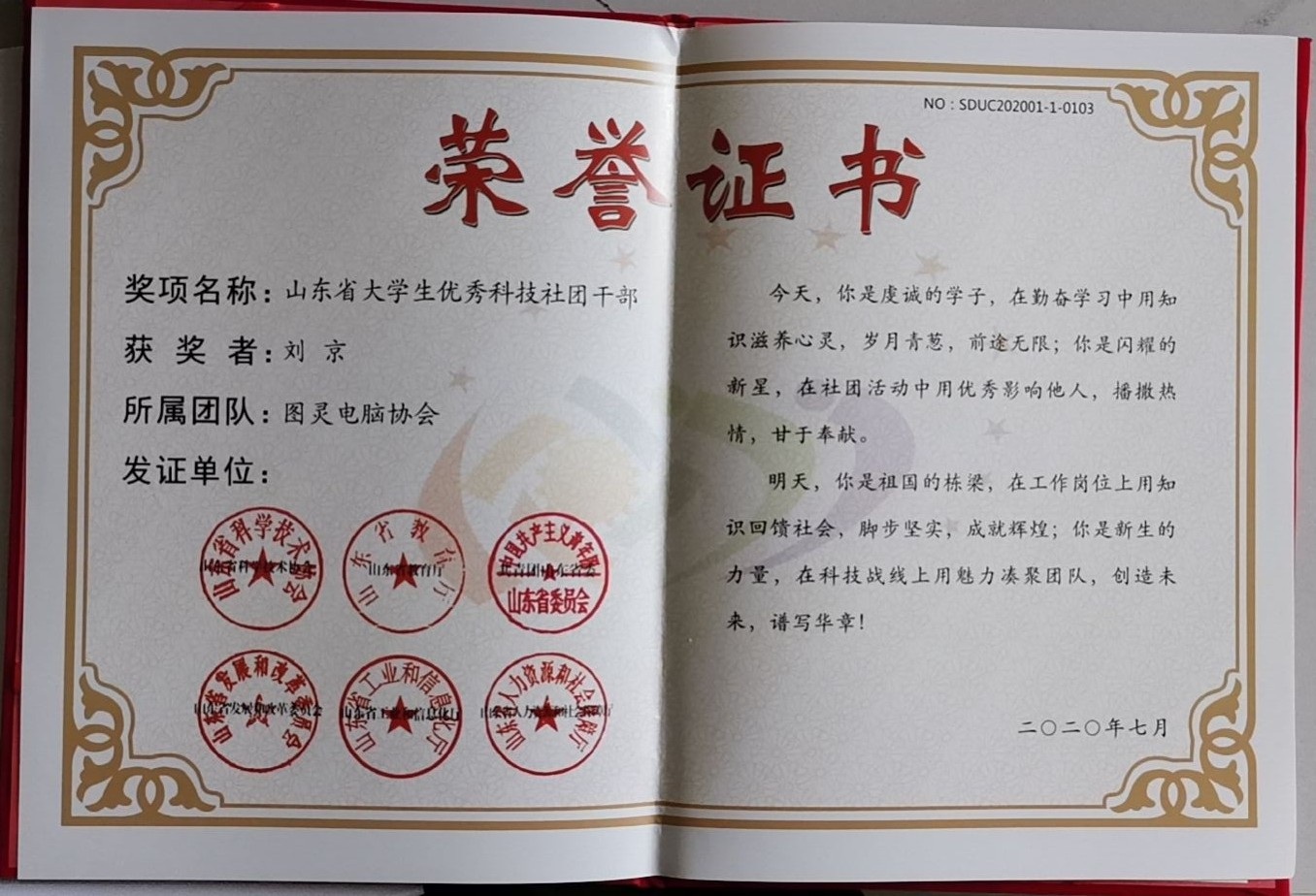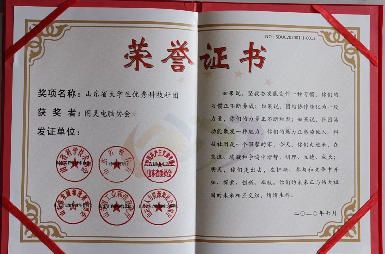 近日,按照山东省科技协会、山东省教育厅、共青团山东省委、山东省发展和改革委员会、山东省工业和信息化、山东省人力资源和社会保障厅《关于举办第十二届山东省大学生科技节的通知》,省科协组织开展了2020年山东省大学生优秀科技社团和优秀科技社团干部评选活动。经评审,我校太阳集团tyc234cc图灵电脑协会荣获“2020年山东省大学生优秀科技社团”称号,刘京同学获“2020年山东省大学生优秀科技社团干部”。