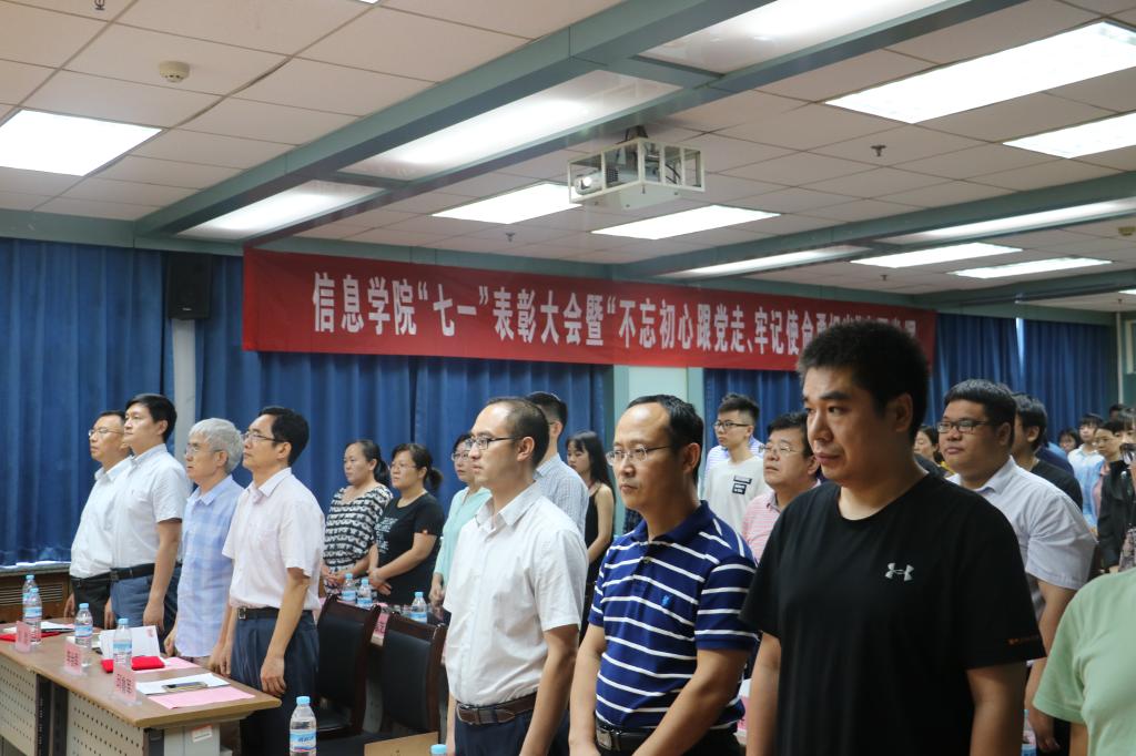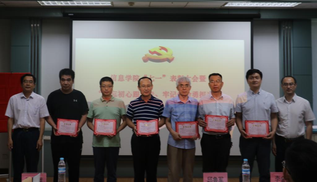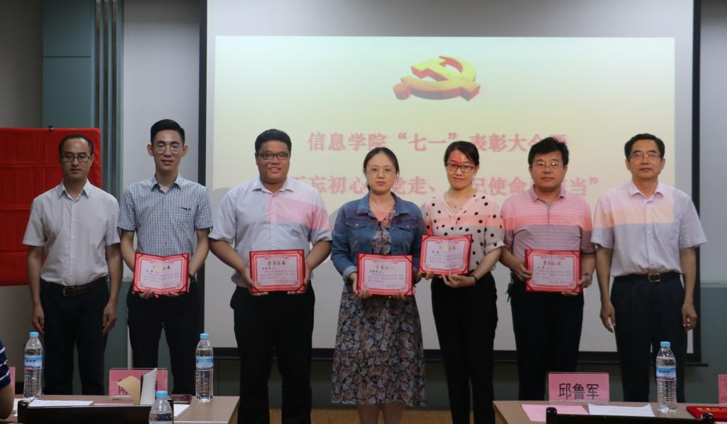 为庆祝中国共产党成立98周年,深入贯彻落实习近平新时代中国特色社会主义思想和党的十九大精神,扎实推进“不忘初心,牢记使命”主题教育,保持和发展党的先进性和纯洁性,充分发挥先进典型表率示范作用,进一步激励各党支部和党员立足岗位,创先争优,2019年7月2日,太阳集团tyc234cc党委在12J703组织召开“七一”表彰大会暨“不忘初心,牢记使命”主题教育活动。学院党委书记邱鲁军、党委委员、副院长陈贞翔、各党支部书记、受表彰党员、2019年上半年新发展党员及师生党员代表共同参加大会。大会由学院党委副书记、副院长董晓宁主持。
