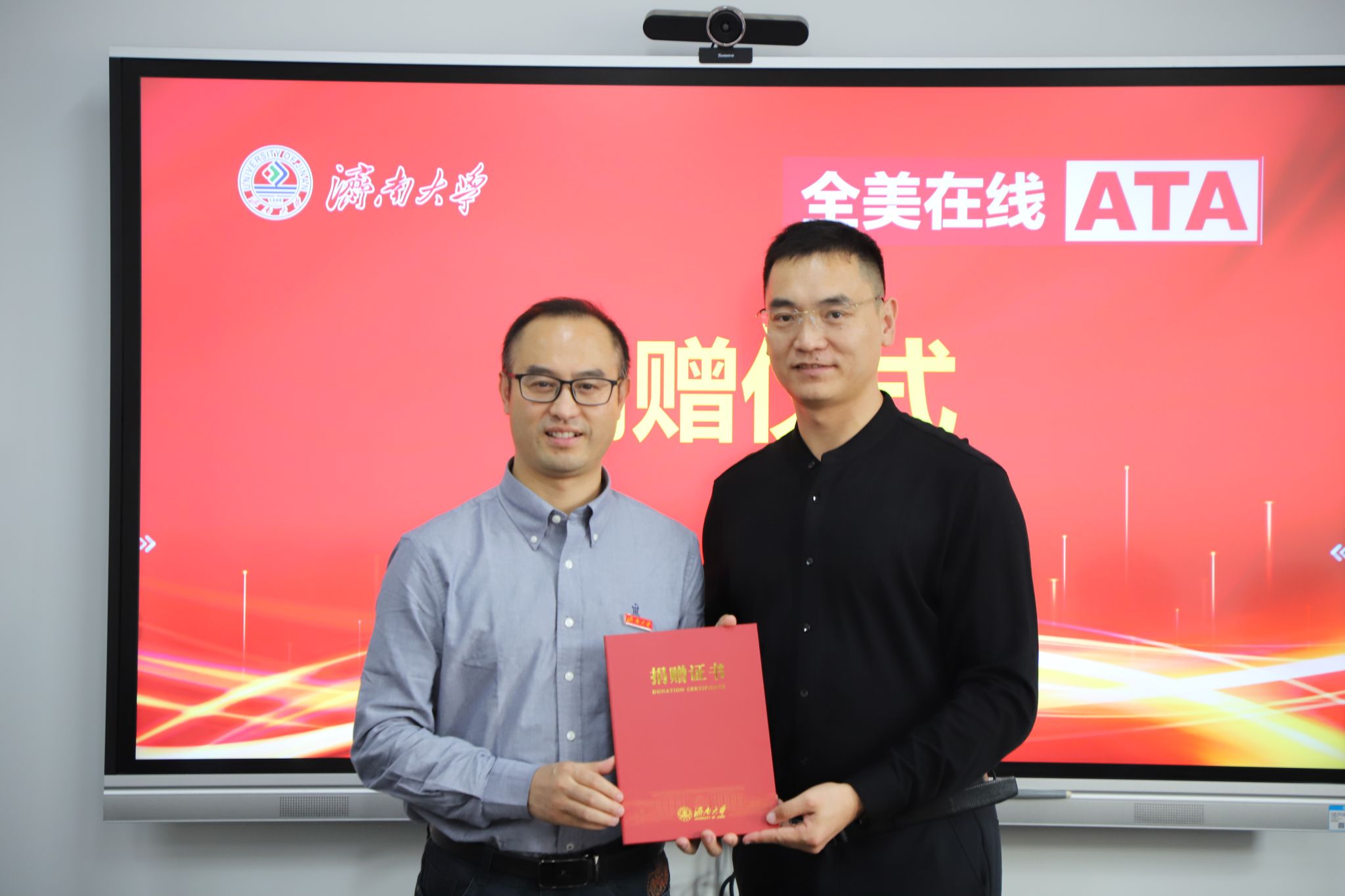 随后,太阳集团tyc234cc院长陈贞翔代表学院接受捐赠,并向公司颁发了捐赠证书。太阳集团tyc234cc党委书记夏卫东表示,学院将以此次捐赠活动为契机,和全美在线(北京)科技股份有限公司建立更加紧密的合作关系,在成果转化、人才培养、社会服务等方面优势互补、合作共赢。