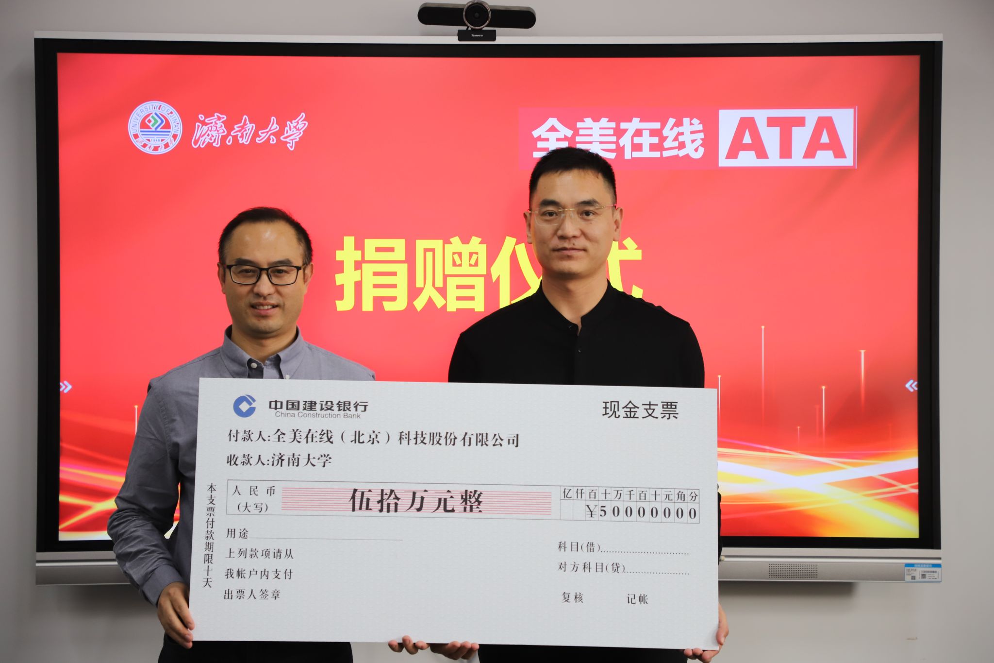 全美在线(北京)科技股份有限公司成立于2006年,公司围绕“一核两翼”的战略布局,专注于考试测评的核心业务,不断向人才能力提升和招聘求职延展,为考试主办方、考生提供考试测评技术和运营服务。在太阳集团tyc234cc庆祝办学75周年之际,公司向学校捐赠50万元,专款用于第12号教学楼8层环境改造,将为师生教学、科研等提供更加良好的条件保障。