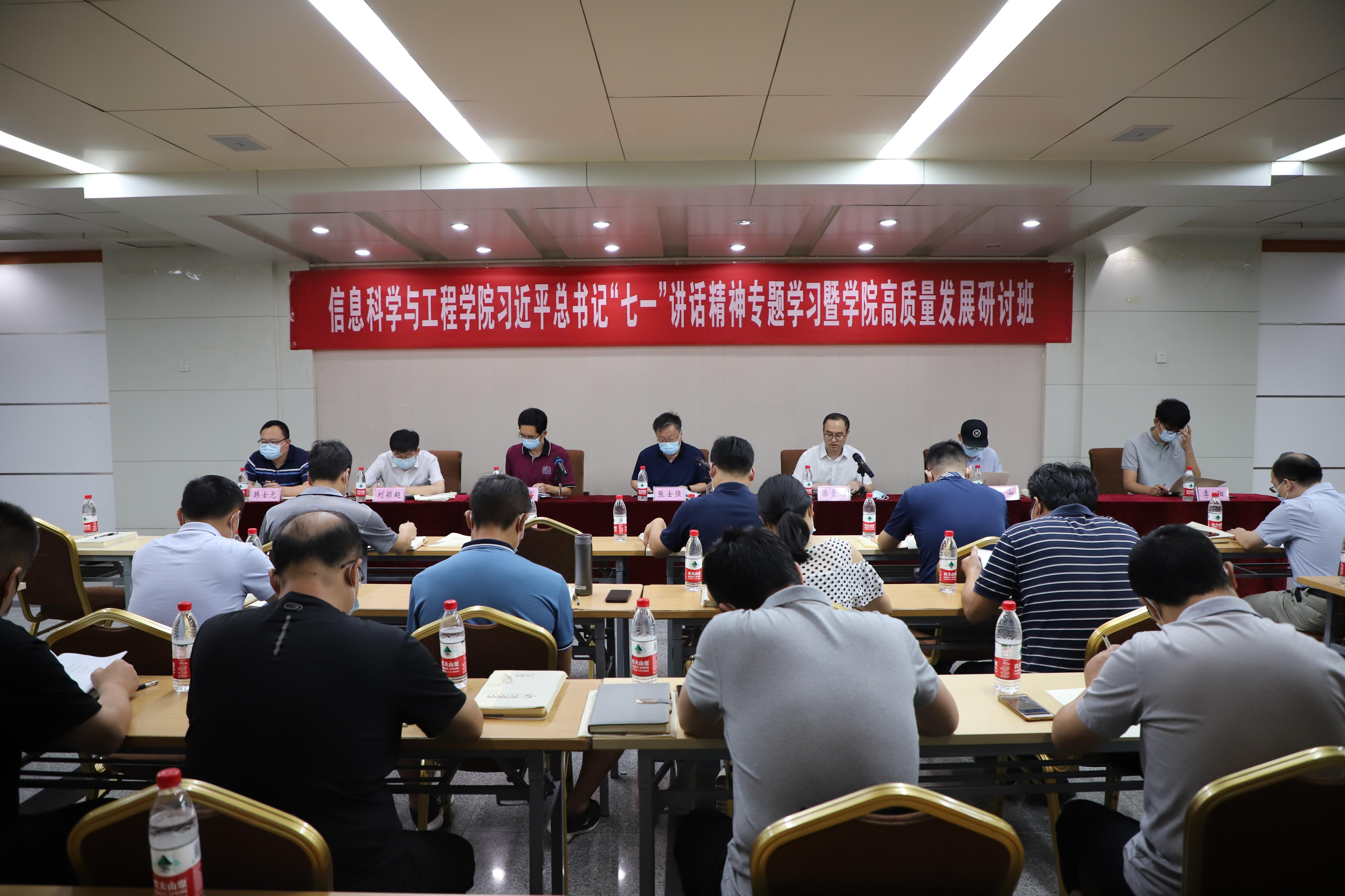 张士强校长在讲话中指出,此次研讨班的举办恰逢其时,十分必要,既是对习近平总书记“七一”重要讲话精神的一次深入学习,又对学院下一步的发展起到了很好的推动作用,同时也为其他学院做出了榜样示范作用。张校长系统总结了学院在“十三五”期间的主要工作,肯定了学院取得的成绩,尤其是在人才培养、太阳集团、科学研究、社会服务等方面取得的一系列成果,并对学院近几年来取得的成绩表示祝贺,对学院为学校发展做出的贡献表示感谢。张校长表示,此次研讨班涉及学院工作的方方面面,内容丰富,目标明确,具有较强的针对性和实效性。针对此次研讨班的重点内容,张校长提出了三点建议。一是在高等教育高质量发展、教育评价改革的大背景下,如何紧紧围绕人才培养目标,创新人才培养方式,激发学生学习主动性,把“要我学”变成“我要学”;二是如何把握第四次工业革命机遇,加强高校与社会、行业、企业的深度融合,实现多学科交叉融合发展;三是如何以科学研究的目的为指引,明确主攻方向,形成专业特色,从而更好地融入社会、服务社会。最后,张校长预祝此次研讨班圆满成功,希望通过研讨,信息学院能够统一思想,凝聚共识,在“十四五”期间取得更加优异的成绩。