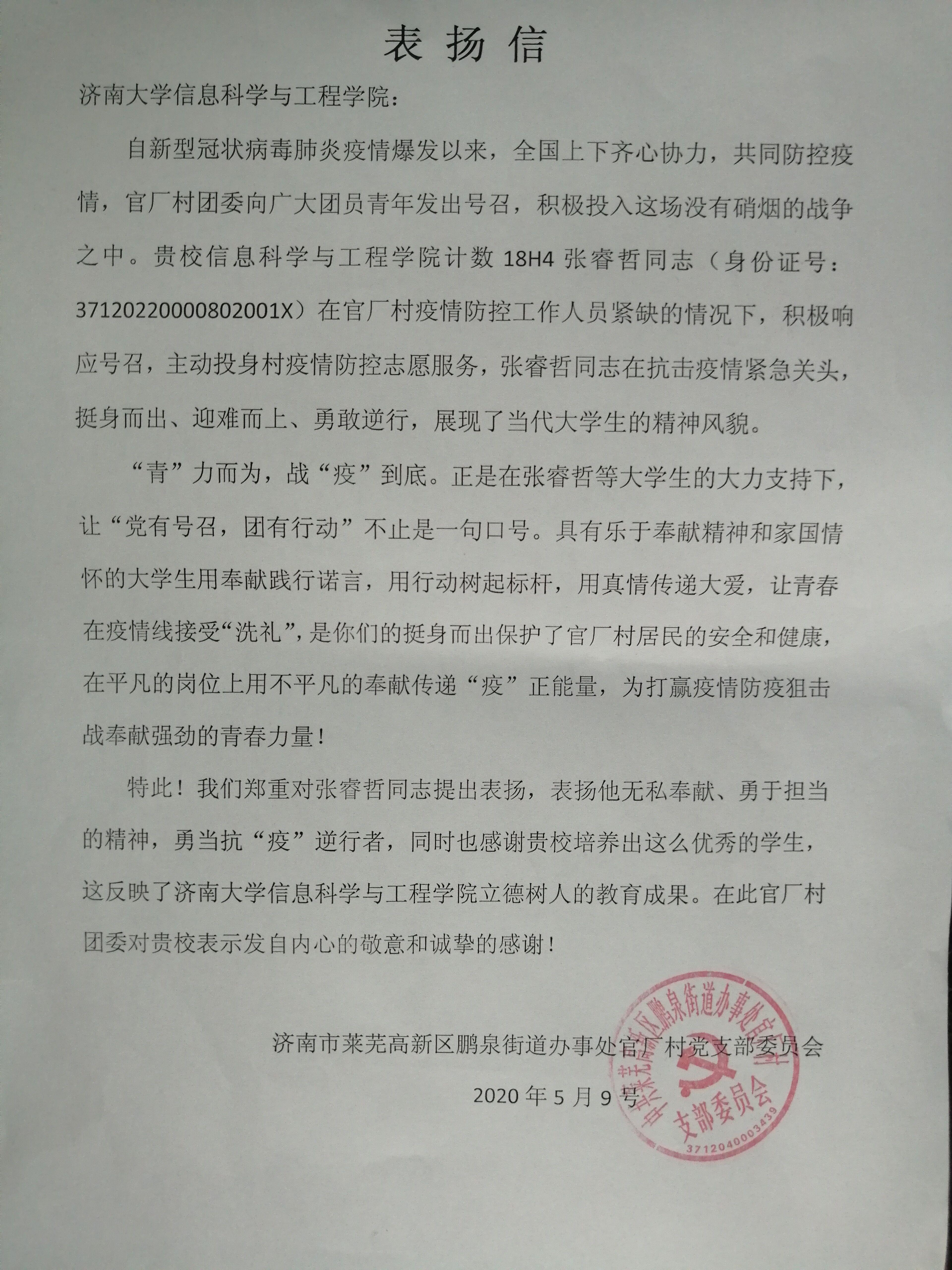 2020年5月14日,太阳集团tyc234cc收到一封来自“济南市莱芜高新区鹏泉街道办事处官厂村党支部委员会”的感谢信,感谢我院大学生计数18H4张睿哲同学为当地的疫情防控做出的贡献,赞扬张睿哲同学这种无私奉献的精神。