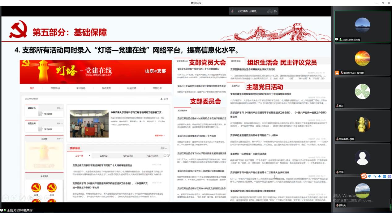 最后,李超书记总结讲话,他对各党支部书记对此次述职考核工作的精心准备和一年来的辛勤付出表示感谢,对各党支部克服疫情困难高质量完成各项工作表示感动和祝贺,对进一步抓好党支部党建工作提出三点建议,一是要以政治理论学习为抓手,进一步落实思想建设责任。深入学习贯彻习近平新时代中国特色社会主义思想和党的二十大精神,强化理论武装,将学习党的二十大精神的理论成果转化为推动学院事业发展的实践力量。二是要以过硬党支部建设为抓手,进一步加强基层党支部建设。认真贯彻落实《中国共产党普通高等学校基层组织工作条例》《中国共产党支部工作条例(试行)》,创新党支部活动方式,持续培育“一支部一品牌”党建特色品牌,深入推进党建联建共建,增强党支部活力,培育高质量党建创新成果。三是要以党员队伍建设为抓手,发挥党员先锋模范作用。对党员开展多形式、分层次的教育培训,加强党员教育管理监督,进一步完善督查和考核评价机制,加强分类指导,细化责任清单,发挥党员在课程思政、学风建设、学科竞赛等方面的作用。