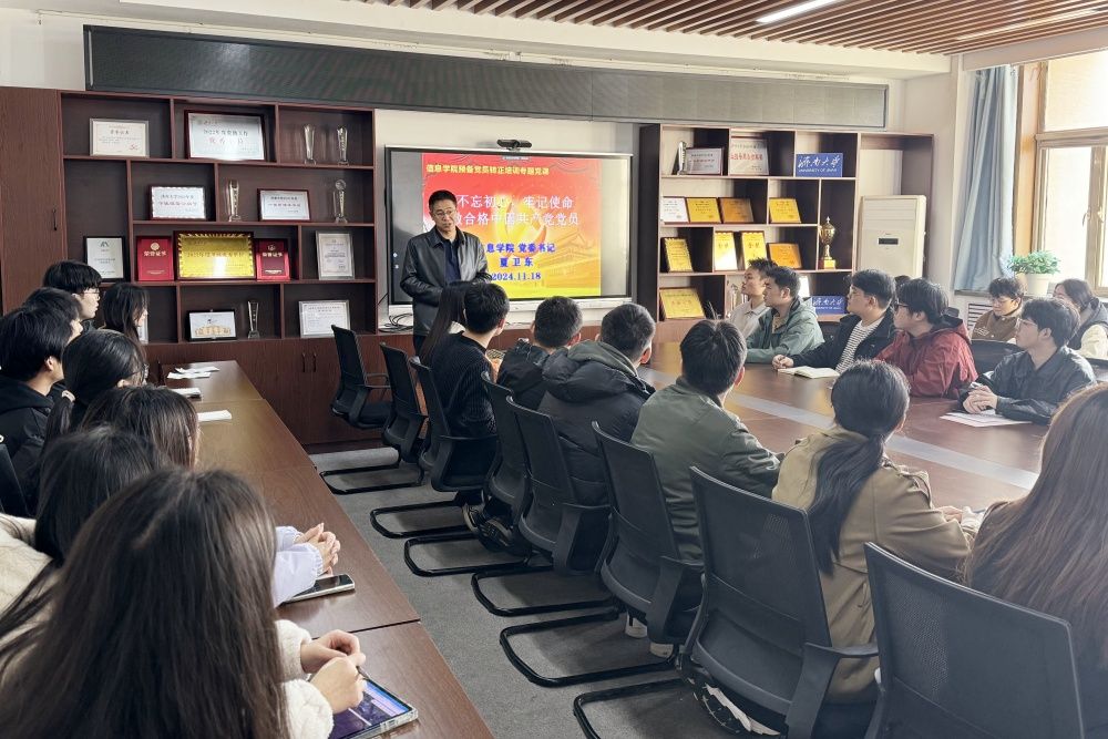 按照《中国共产党党员教育管理工作条例》要求,为进一步做好预备党员转正培训教育工作,提高预备党员的政治素养和理论水平,11月18日,太阳集团tyc234cc党委书记夏卫东以《不忘初心,牢记使命做合格的中国共产党党员》为题,为学院2024年下半年即将转正的44名预备党员讲授专题党课,组织员、学生党支部支委参加了此次培训。