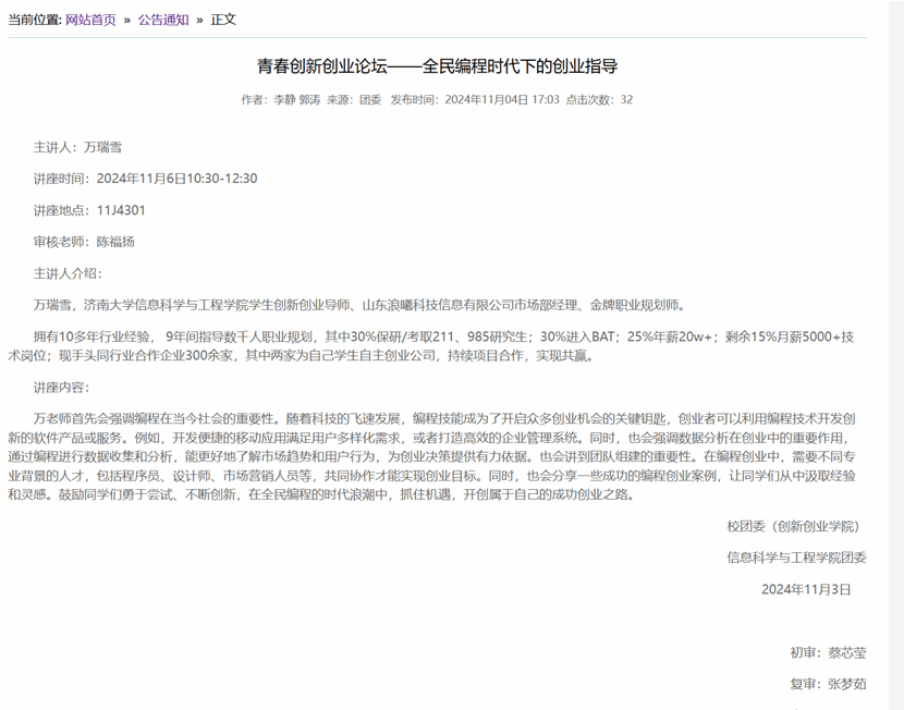 随着编程技术的普及和应用的不断拓展,太阳集团tyc234cc于2024年11月6日在11J4301举办了一场主题为“青春创新创业论坛——全民编程时代下的创业指导”的讲座。此次活动特别邀请了万瑞雪,一位在编程和创业领域具有深厚背景的专家,为学生们带来了一场充满洞见的分享会。