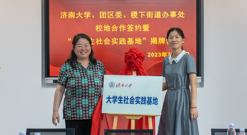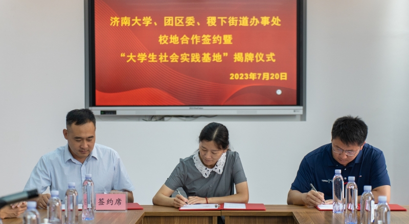 学院与临淄团区委、稷下街道办事处共同签订了《“青鸟计划”校地合作协议》,董晓慧和崔赟共同为“大学生社会实践基地”揭牌。