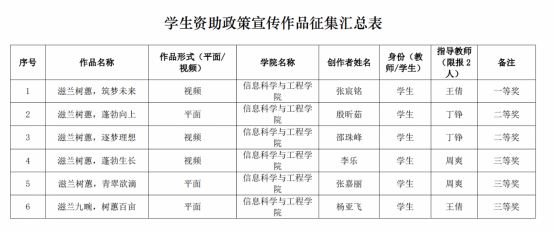 比赛的进行模式为线上比赛,比赛由资助服务中心发布到各班级群吸引众多同学参加,首先由组织者将在符合时间内和符合报名条件的作品筛选并整理送至评审团评选。评审团由资助服务中心部长及部分干事组成,主要从设计理念、设计技巧、视觉效果等方面进行评价。初评过程中,评委们会对每一份作品进行细致的观察和分析,确保每一份作品都能得到公正的评价。初评结束后,评委们会根据作品的得分情况,选出一定数量的优秀作品进入复评。复评中,评委们会对作品的各个方面进行全面的评价,包括设计理念的创新性、设计技巧的熟练程度、视觉效果的吸引力等。同时,评委们也会对作品的实用性和社会价值进行深入的探讨。最终,评委们会根据作品的综合表现,选出获奖的作品。下面是获奖作品名单: