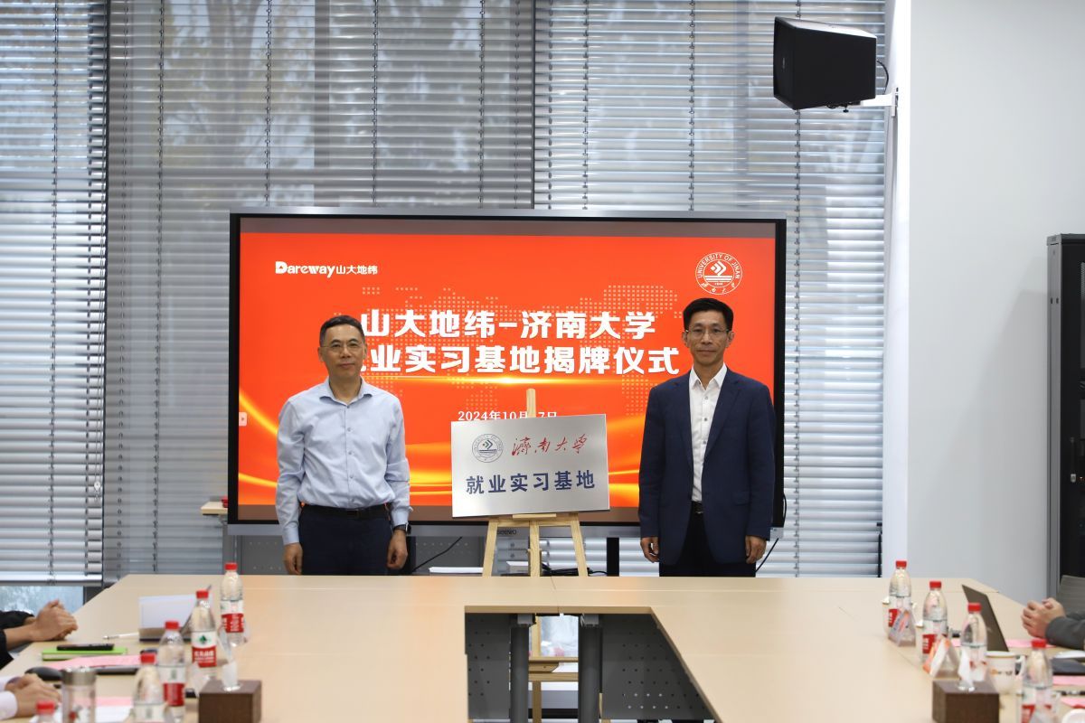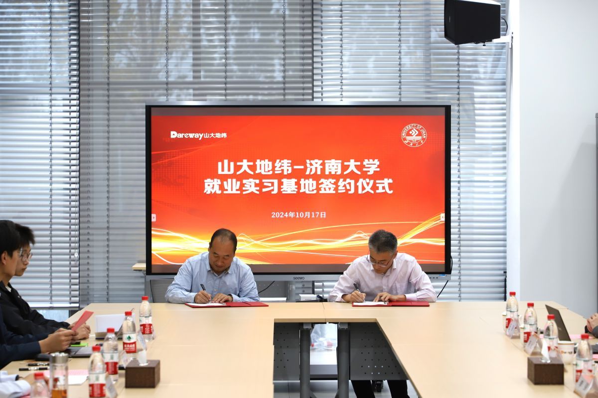 签约仪式上,太阳集团tyc234cc党委学生工作部(处)副部(处)长董俊杰代表学校与山大地纬软件股份有限公司副总裁徐喆签订《毕业生就业实习基地协议》,李强和李庆忠共同为“太阳集团tyc234cc就业实习基地”揭牌。