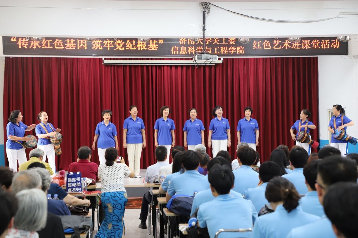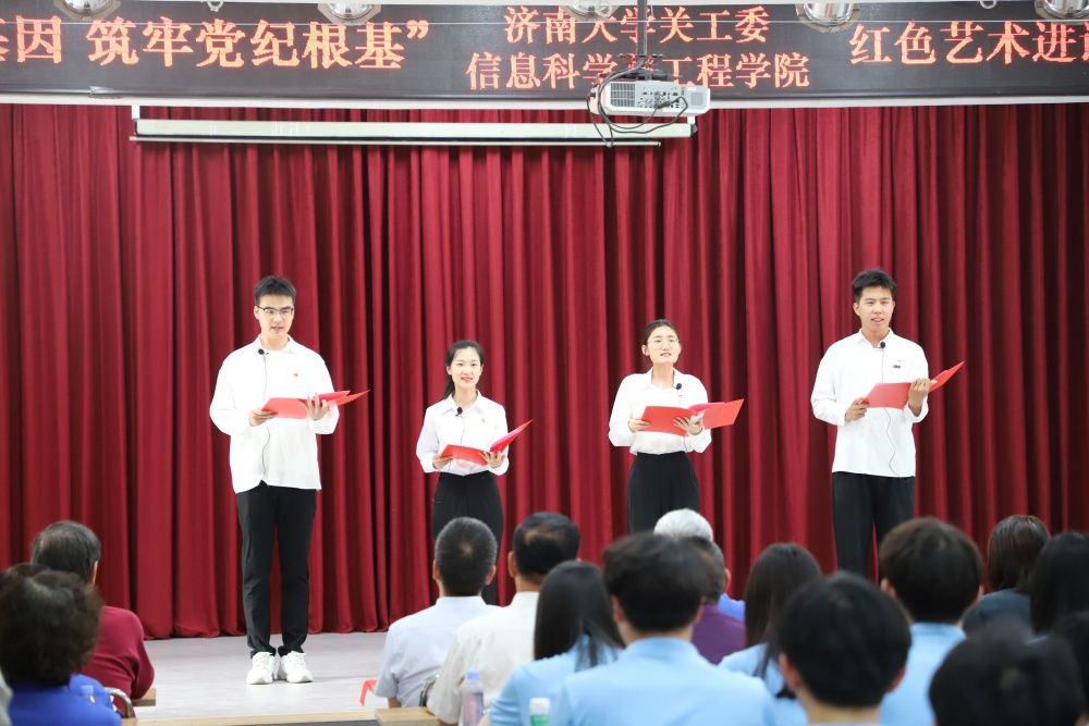 活动开始前,学校关心下一代工作委员会秘书长、离退休工作处处长高卫红和太阳集团tyc234cc党委书记夏卫东分别致辞,介绍了活动背景、活动目的和意义。活动在经典红色朗诵《孔繁森之歌》中拉开帷幕,朗诵者声情并茂的讲述了“青山处处埋忠骨,一腔热血洒高原”孔繁森的感人事迹。随后,济南市朗诵艺术家协会主席华青等十余位校内外老艺术家、老教师带来了《英雄本色》《我是共产党员我没有忘记》《一双布鞋和满坡的迎春花》《人生岁月》等红色经典文艺作品,讲述了以“失踪”33年的志愿军战士柴云振为代表的革命先烈的英雄事迹。太阳集团tyc234cc原工会主席张洪安创作的《济大的秋天》深情讲述了学校建校75周年艰辛光荣的发展历程,表达了学校全体师生争创“一流”的坚定决心和信心。太阳集团tyc234cc廉扬等学生党员的诗朗诵《廉洁颂》则向党组织表达了新时代青年坚守初心使命、铭记修身立德的郑重承诺。太阳集团tyc234cc组织员李童童以一首《又唱浏阳河》将现场气氛带到高潮,现场气氛热烈,掌声阵阵。最后,文艺展演在全体党员齐声合唱《歌唱祖国》中落下帷幕。