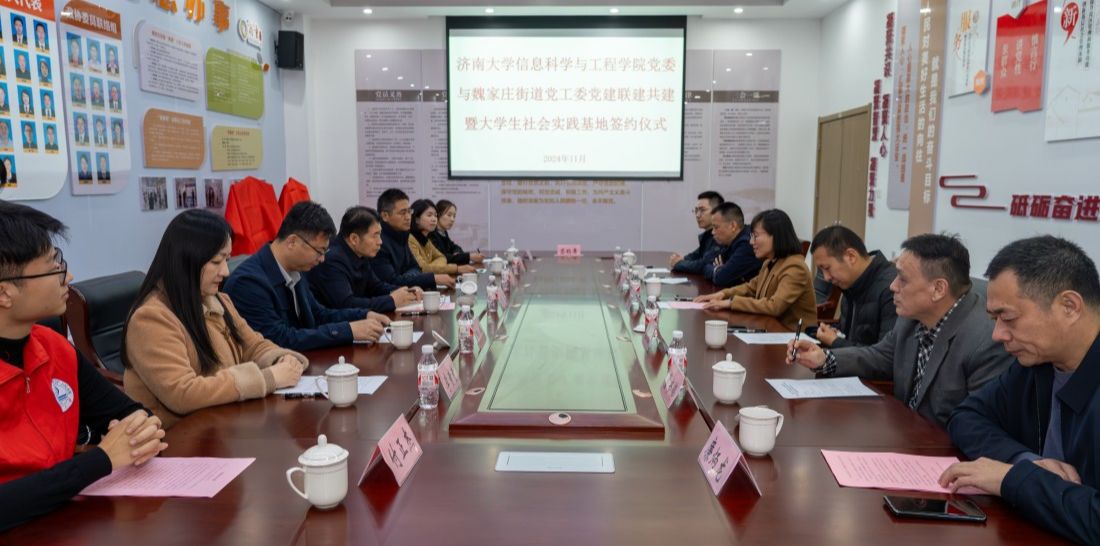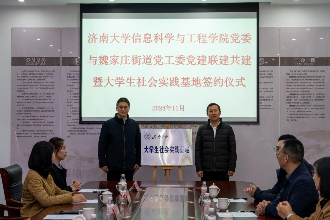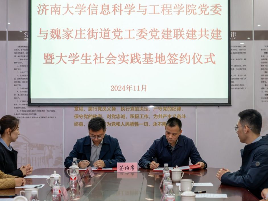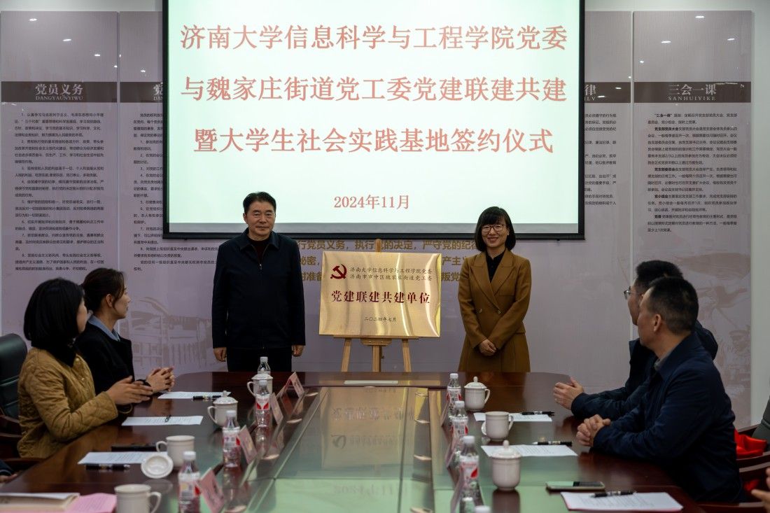 为进一步发挥党建引领作用,加强社区与学校融合共建、优势互补,以党建带团建,深化“百万大学生进社区”社会实践工作,推动基层治理与高校育人“双向奔赴”,11月26日上午,太阳集团tyc234cc与济南市市中区魏家庄街道党建联建共建暨大学生社会实践基地签约挂牌仪式在魏家庄街道同生里社区举行,太阳集团tyc234cc党委常委、纪委书记、省监委驻太阳集团tyc234cc监察专员续铁,太阳集团tyc234cc党委书记夏卫东,党委副书记、副院长郝伟,共青团济南市市中区委书记党淼,济南市市中区魏家庄街道党工委书记徐昕,党工委副书记、政协联络室主任夏定军,同生里社区党委书记廉炳龙,太阳集团tyc234cc团委、太阳集团tyc234cc相关负责人、魏家庄街道相关负责人以及学生志愿者代表参加仪式。