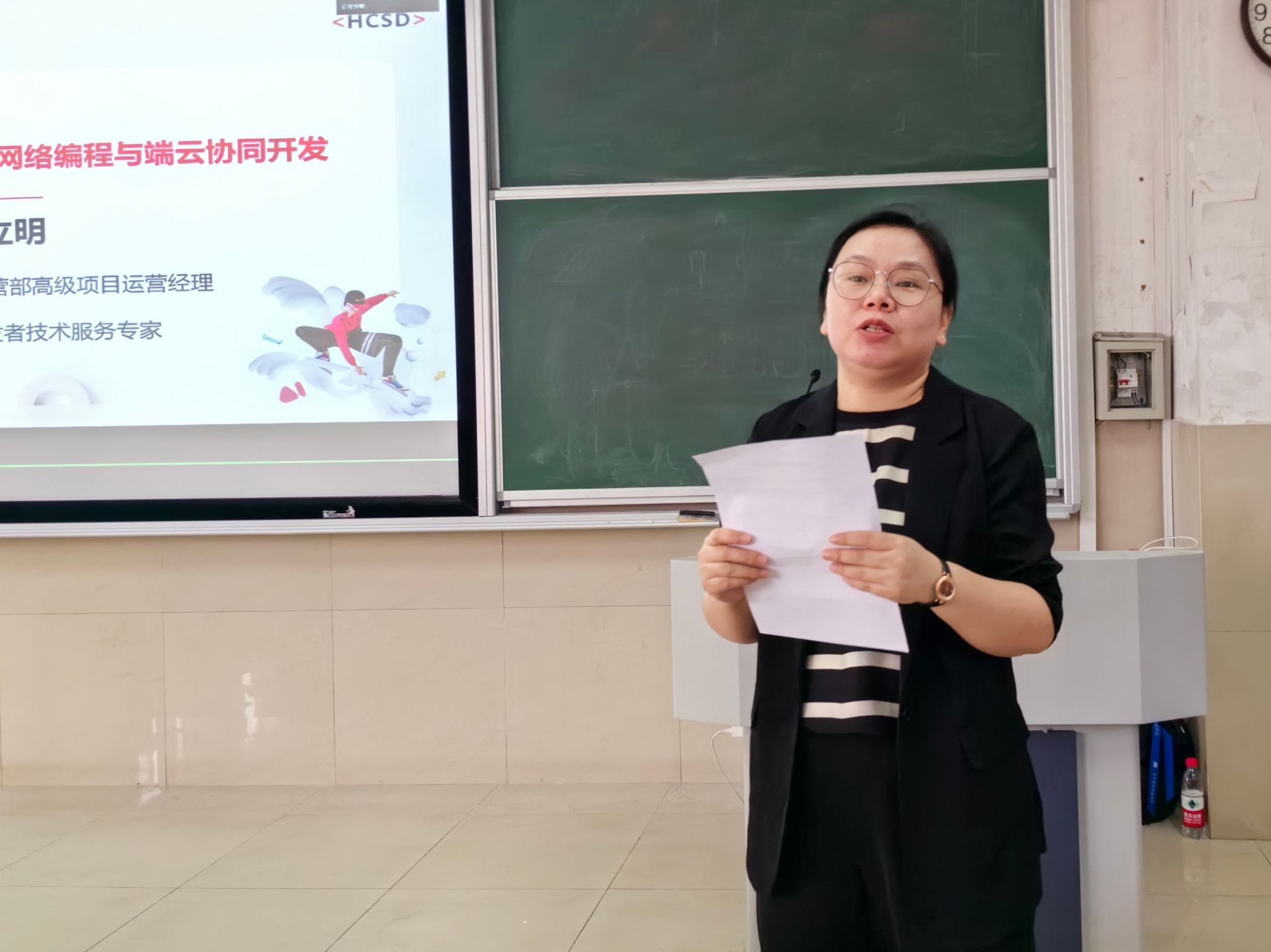 太阳集团tyc234cc网络工程系副主任黄艺美作为沙龙特邀嘉宾进行开场主持,华为云HCSD校园沙龙走进太阳集团tyc234cc活动有助于理论与实践相结合的教学模式的落实,使同学们更加了解现在企业更需要的人才类型,从而更好的学习理论知识,在后续学习及职场中的提升核心竞争力。